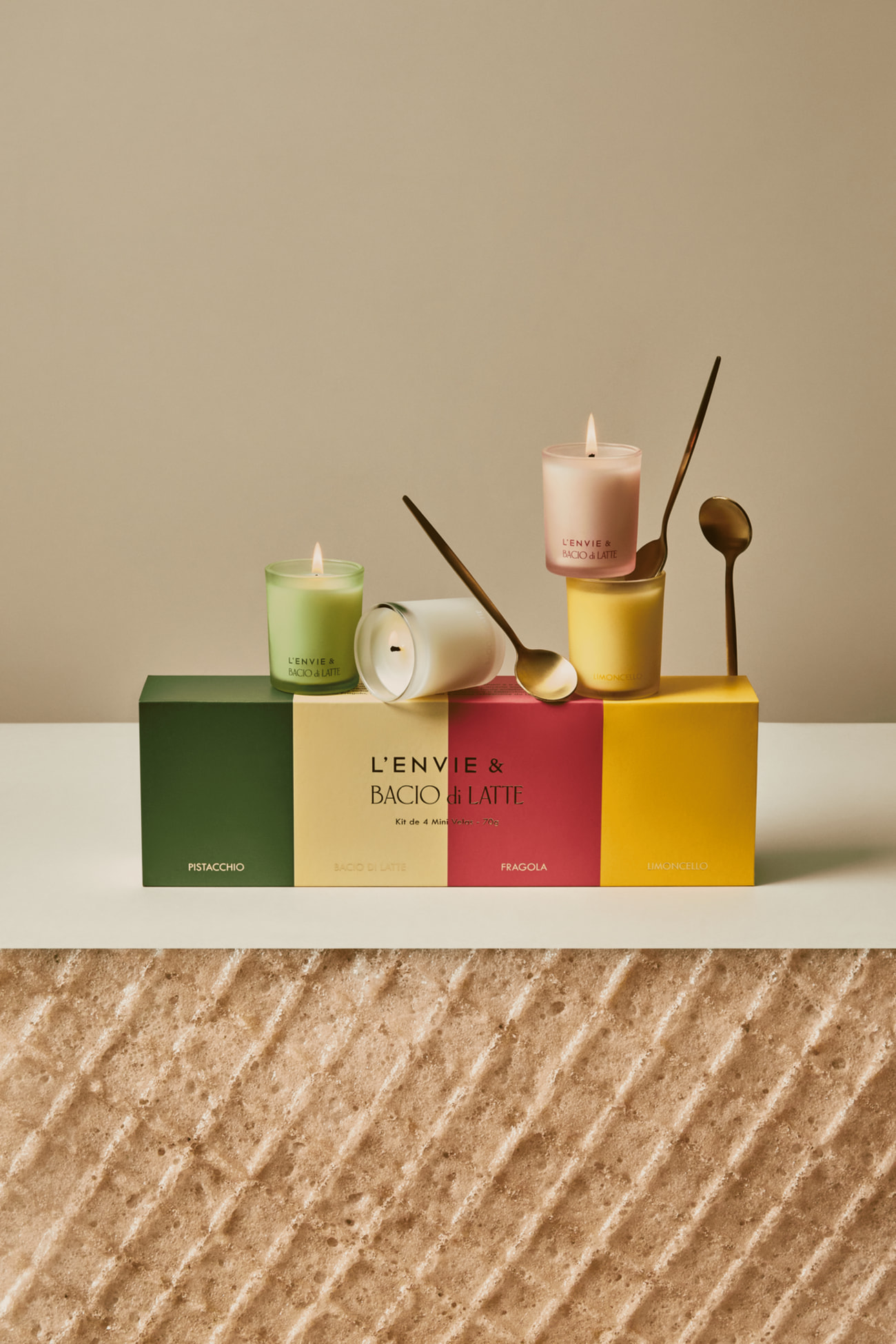 Do encontro entre o Chef da Bacio di Latte Oliver Kirkham e o casal de perfumistas da LENVIE, Fanny Grau e Isaac Sinclair, surge uma parceria inusitada: a criação de fragrâncias que trazem a sensação de uma tarde ensolarada na Itália, com uma colherada dos gelatos mais icônicos como o Pistacchio, Bacio di Latte e Fragola, finalizados com o ritual e aroma refrescante do Limoncello. Arquitetura e decoração já faziam parte da Bacio di Latte e agora